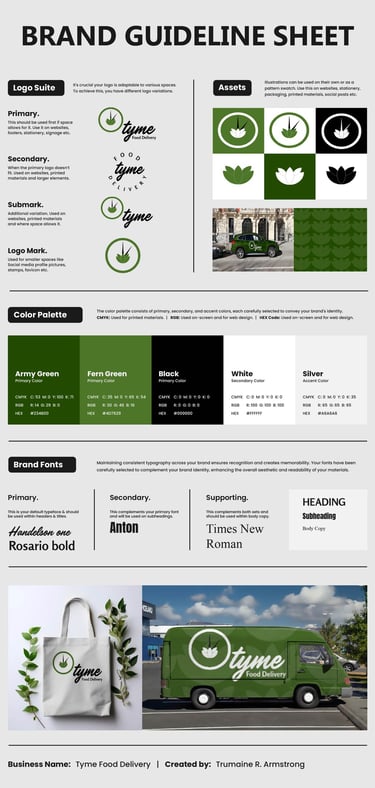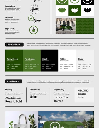 Tyme Food Delivery provides round the clock food delivery services to customers in residential and commercial areas. This branding shows all the logos, colors and examples that will be used with the Tyme branding.